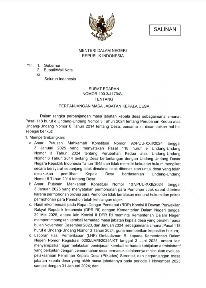 Surat Edaran Nomor 100.3/4179/SJ tentang perpanjangan masa jabatan kepala desa. Klik disini untuk baca lengkap (Tangkapan layar)