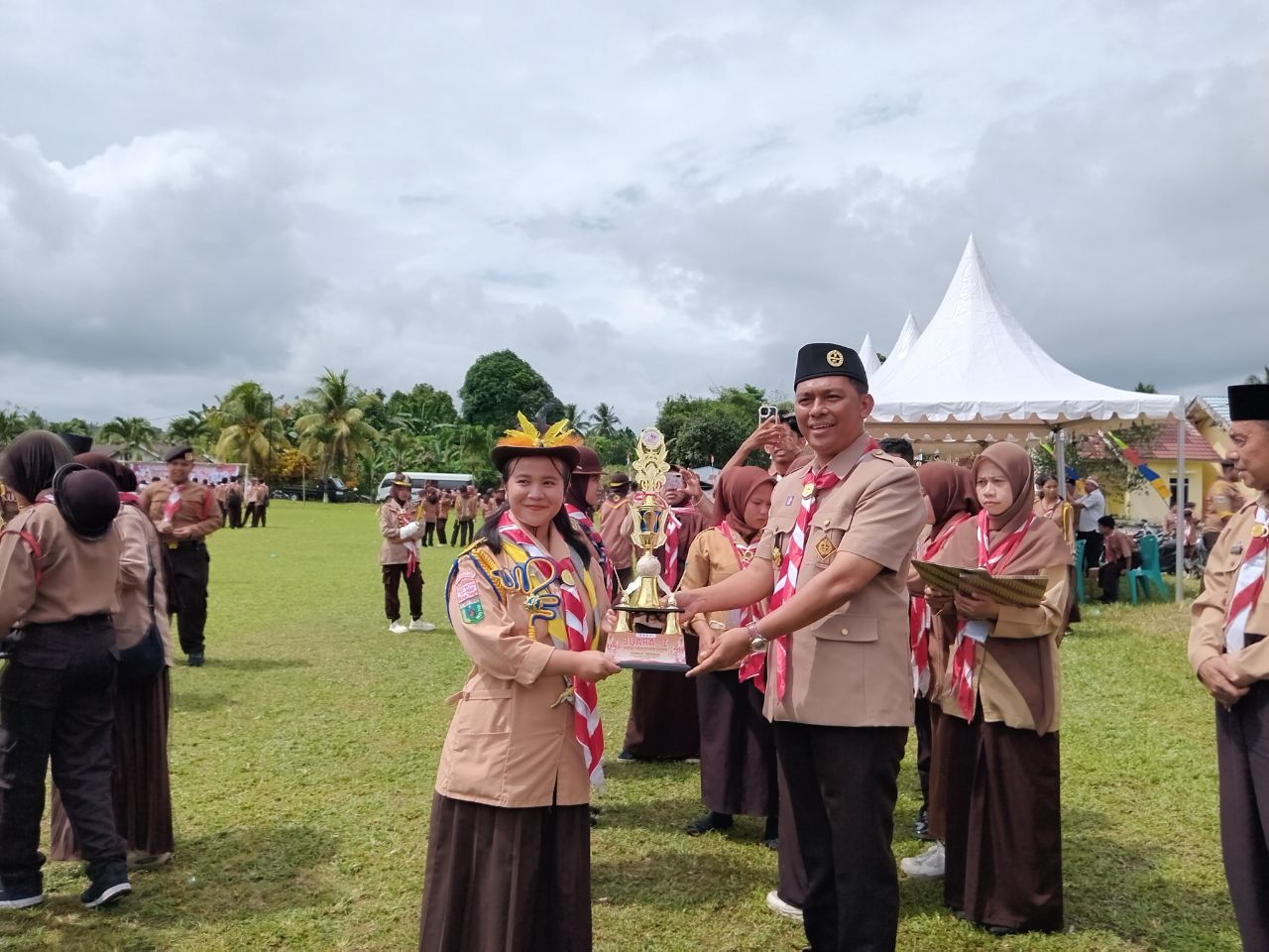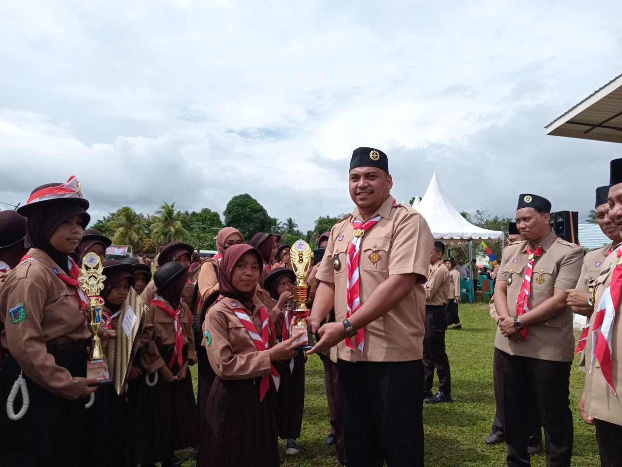 Ketua Kwarcab Patwan Kuba menyerahkan piala di lomba Semaphore (Foto: Nomo/ BanggaiTerkini)