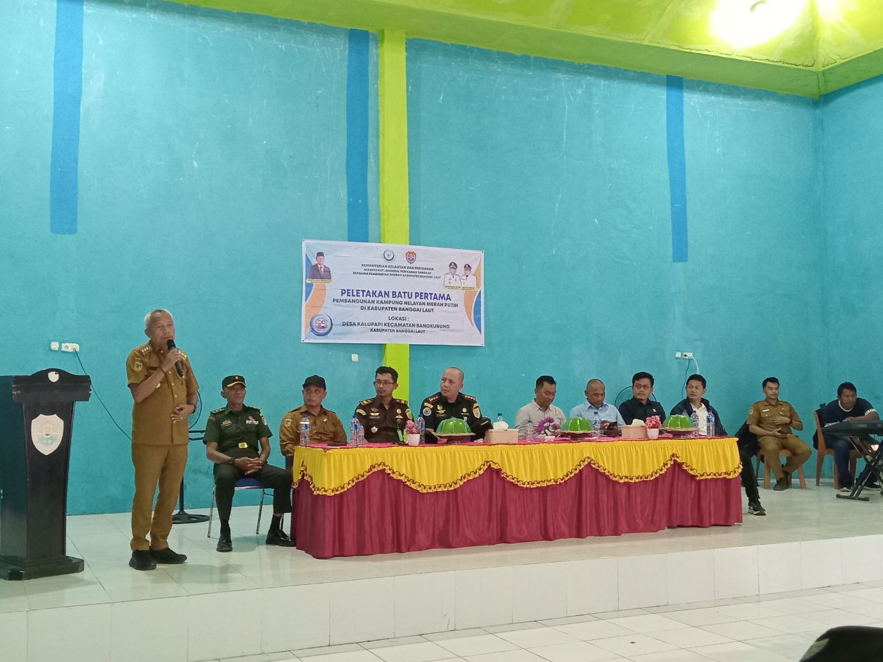 Bupati Sofyan memberikan keterangan pers saat melakukan peletakan batu pertama pembangunan Kampung Nelayan Merah Putih (KNMP) di Desa Kalupapi, Bangkurung, (Foto : Nomo/BanggaiTerkini)