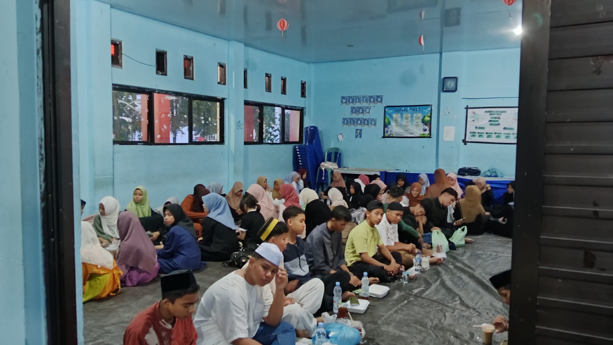 Seluruh peserta bersama-sama menikmati hidangan berbuka puasa yang telah disiapkan. Kebersamaan tampak begitu hangat saat siswa dan guru duduk berdampingan menikmati makanan sederhana namun penuh makna.